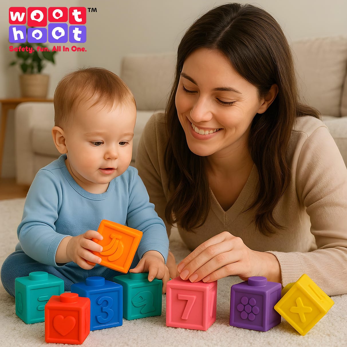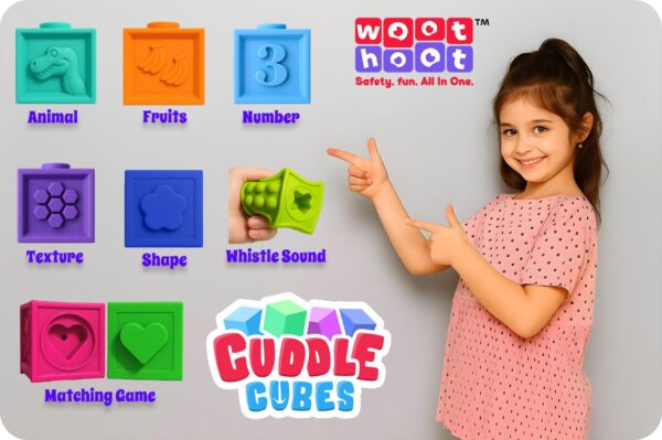 Block play builds spatial reasoning, colour recognition, fine motor control and early mathematical thinking — all at once. WootHoot Cuddle Cubes take classic block play to the next level with 7 distinct learning themes, tactile textures and whistle sounds in one beautifully designed set. Unlike hard plastic baby building blocks, Cuddle Cubes are made from soft, food-grade silicone — gentle on little hands and completely safe to chew.