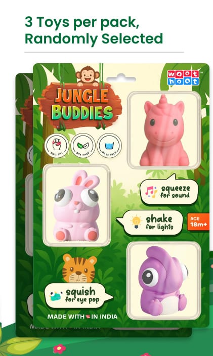 These squeeze toys for babies make a wonderful baby shower gift, birthday present or festive surprise. Compact, colourful and endlessly fun — guaranteed to be a hit with both babies and parents. Jungle Buddies are tested rigorously — every character passes quality checks to meet India’s mandatory safety standards. The pack-of-3 format means your baby always has a fresh character to explore. And because each character is randomly selected, every pack is a little surprise — which children absolutely love.